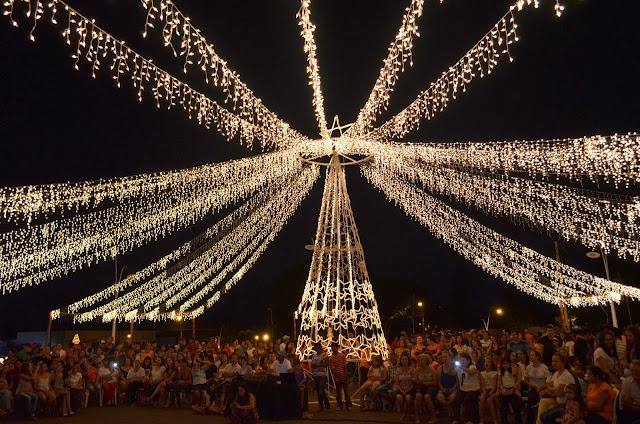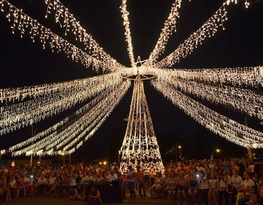 Evento natalino com luzes, apresentações e encanto, celebrando a magia do fim de ano.
